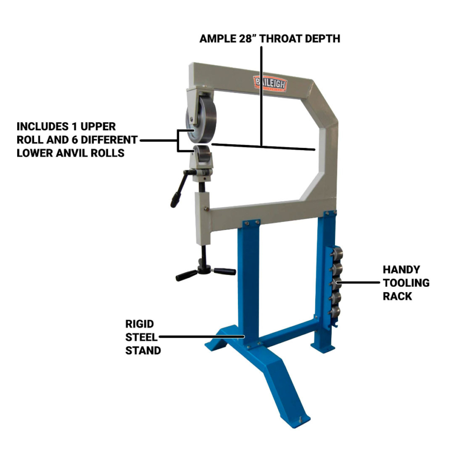 Baileigh EW-28 on ammattikäyttöön suunniteltu englanninpyörä, jossa on 710mm (28″) kitasyvyys ja 6 erilaista vaihtorullaa vakiona. Mukana 2”, 3”, 4”, 6”, 8” ja 12” rullat.