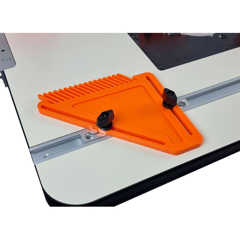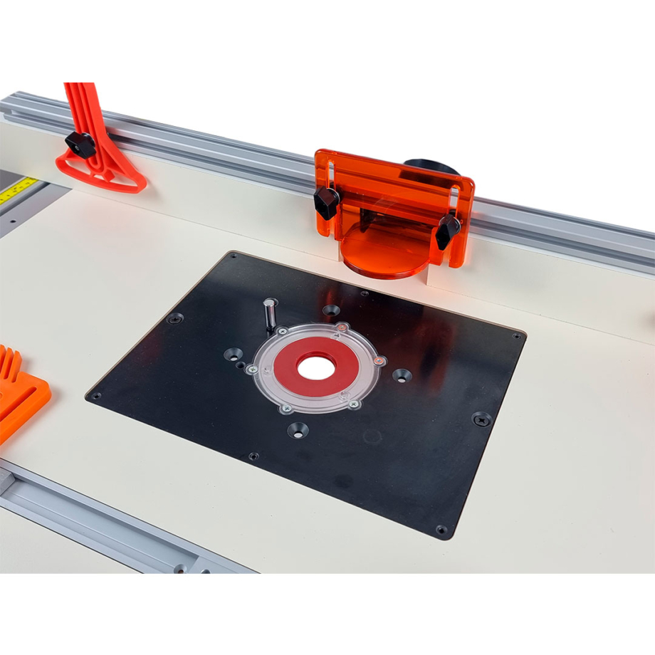 Jyrsinpöydässä on iso 306 x 229mm yläjyrsimen asennuslevy, johon saat porattua sopivat kiinnitysreiät lähes mille tahansa yläjyrsimelle. Asennuslevyssä on valmiit kiinnitysreiät CMT 7E ja Triton TRA001 yläjyrsimille sekä valmiiksi tehty läpivienti terän korkeudensäätöveiville.
