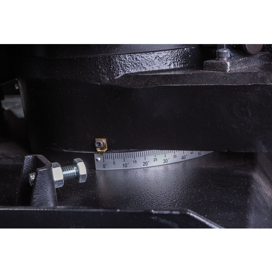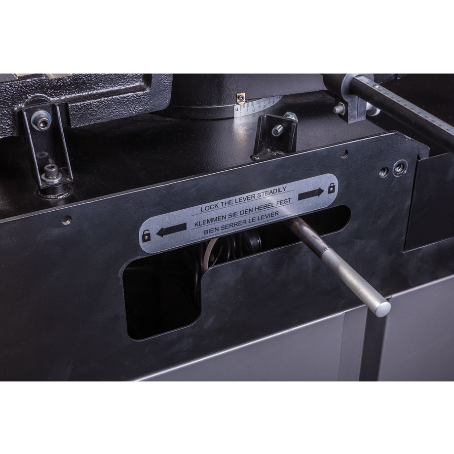 Vannesahassa on molempiin suuntiin käännettävä sahakaari (-60/+45) ja helppokäyttöinen ohjauspaneeli, jonka näppäimillä voit suorittaa työkappaleen kiinnityksen ja säätää portaattomasti terän korkeutta, laskunopeutta ja kierrosnopeutta.