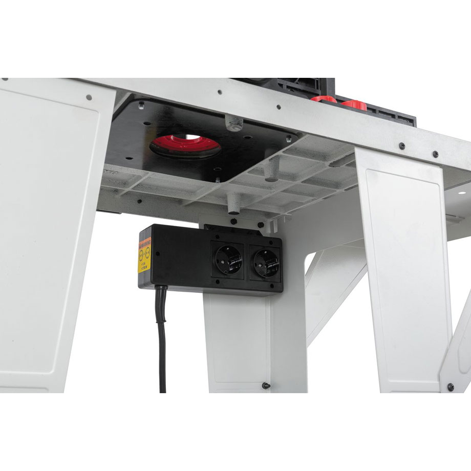 Jyrsinpöydän mukana tulee yläjyrsimen kiinnityslevy, johon voit porata helposti sopivat asennusreiät omalle yläjyrsimellesi. Kiinnityslevyssä on esiporatut asennusreiät Triton TRA001 yläjyrsimelle, jonka lisäksi pöydästä löytyy valmiiksi tehty aukko Tritonin korkeudensäätöveiville.