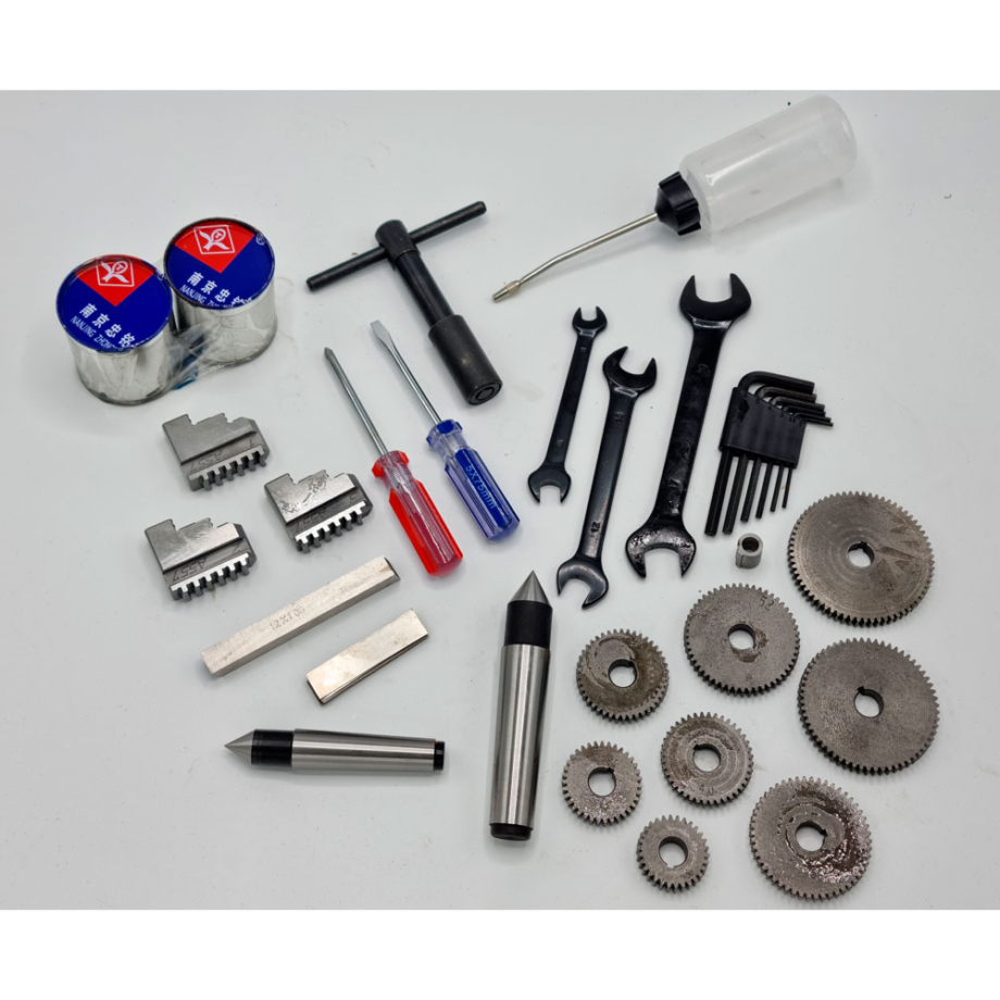 Mukana 3-leukaistukka 100mm, kaksi leukasarjaa, istukka-avain, terä 12 x 12mm, teräpidin, keskiökärki MK-3, keskiökärki MK-2, takaseinä, aluslevy, vaihtorattaat 30/35/40/42/50/52/60/66T ja käyttötyökaluja.
