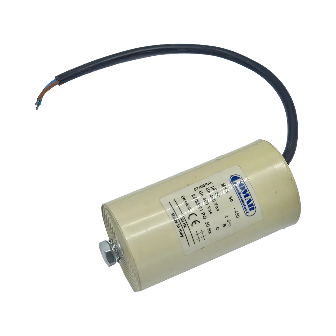 Comar MKA 50 kondensaattori 50UF 400-450V 50hz erilaisiin koneisiin ja laitteisiin. Mitat ø 50 x 105 mm.