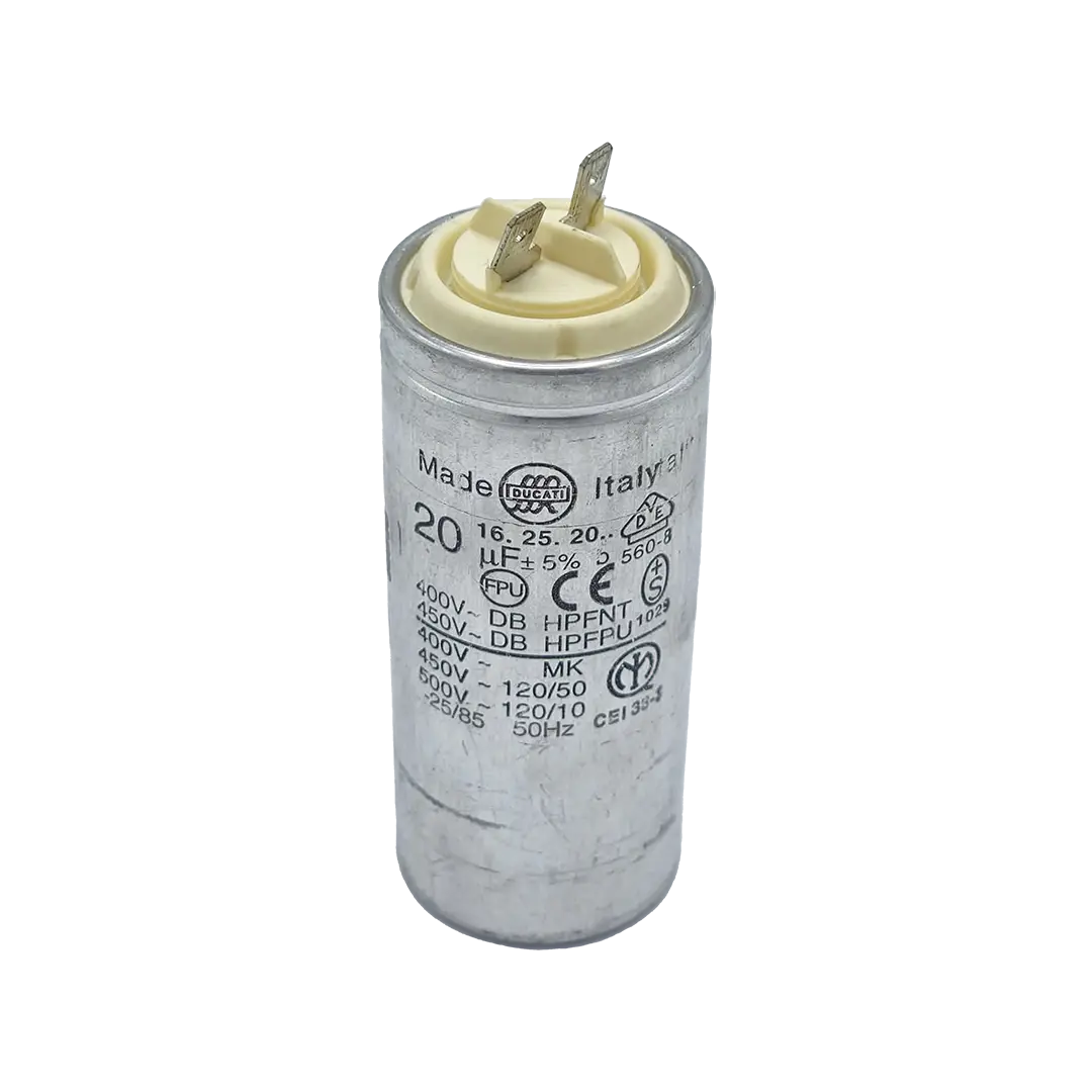 Ducati kondensaattori 20UF 450V 50hz erilaisiin koneisiin ja laitteisiin. Mitat ø 40 x 108 mm.
